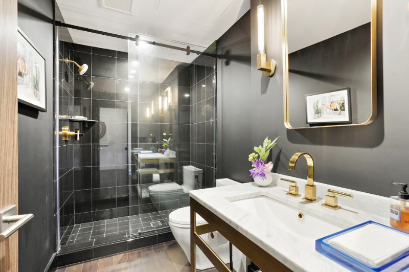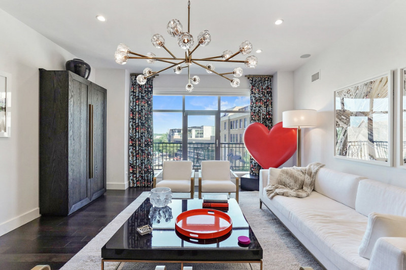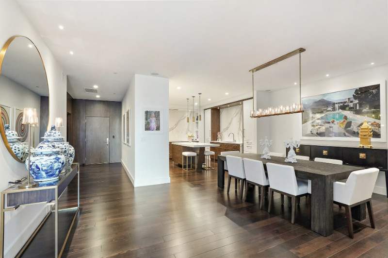 The home features a sleek modern design with rich hardwood floors and premium custom finishes. The luxurious rooms include the refined living room featuring a wall of glass and door to the Juliet balcony with a view of the bustling downtown below.
