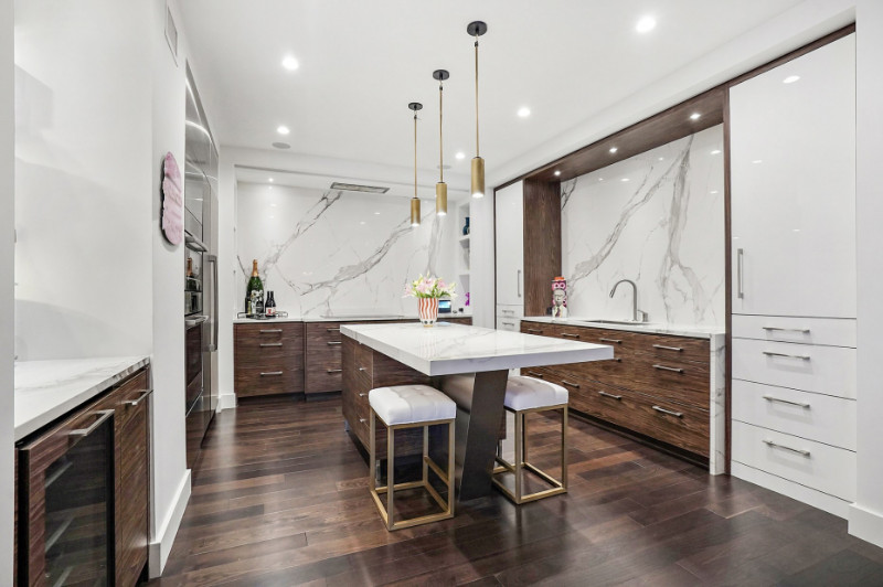 The living room is adjacent to the open dining room which is connected to the chef’s kitchen. The kitchen features marble-clad backsplash walls and counters, custom cabinets, a large center island and professional-grade appliances.